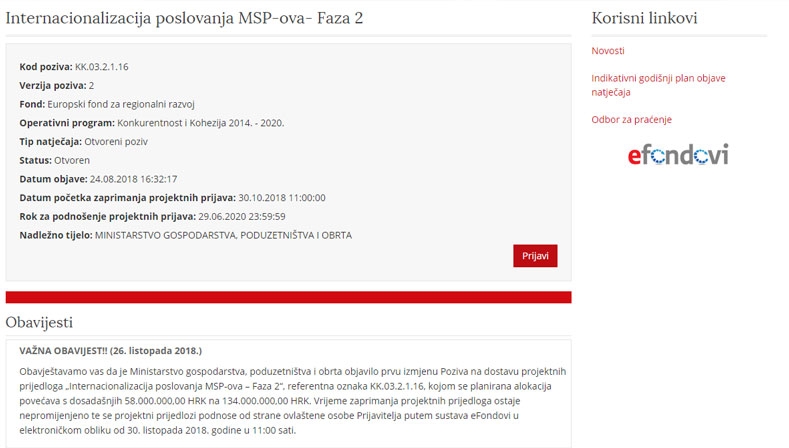 Ministarstvo gospodarstva, poduzetništva i obrta objavilo je prvu izmjenu Poziva na dostavu projektnih prijedloga „Internacionalizacija poslovanja MSP-ova – Faza 2“ kojom je planirana alokacija s dosadašnjih 58.000.000,00 kuna povećana na 134.000.000,00 kuna.